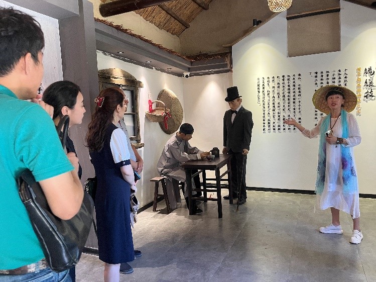 第四站,团队成员到达了桥头镇,先后考察了信河北村和南子城村。信河北村的非遗文化产业园已初具规模,建立了锡镶紫砂、花饽饽、剪纸、柳编、皮影等多种传统手工艺展览和体验区。通过打造威海非遗文化体验基地、青少年研学教育基地、红色东南乡展览馆等项目,为乡村振兴提供了源头活水。南子城村依托所前泊水库这一优势资源,开发特色民宿,对内部环境和硬件设施进行整体提档升级,实施尽享“湖光山色”的陌上乡居休闲体验项目,成功拉动了乡村经济增长。